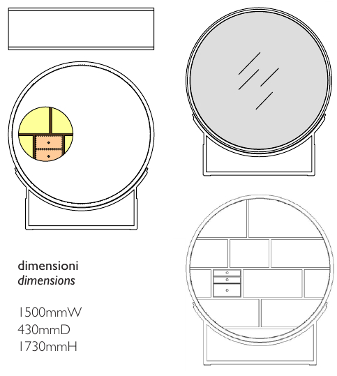 Sucupira wooden frame and shelves, leather revolving door and drawers, copper lacqured back panel inside and bronze-tinted mirror back panel outside, copper finish metal parts.
