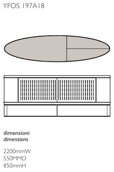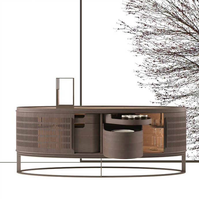 Sucupira or oak structure, leather top, perforated sliding doors, suspended circular revolving metal trays and swing-out drawers inside, warm LED lit interior, metal base.