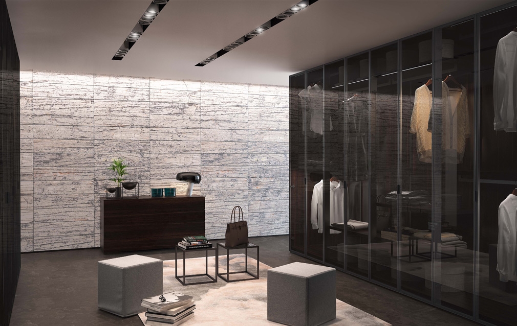 Платяной шкаф с распашными стеклянными дверями. Прозрачная стеклянная дверь Fumé, коричневая алюминиевая рама и ручка.