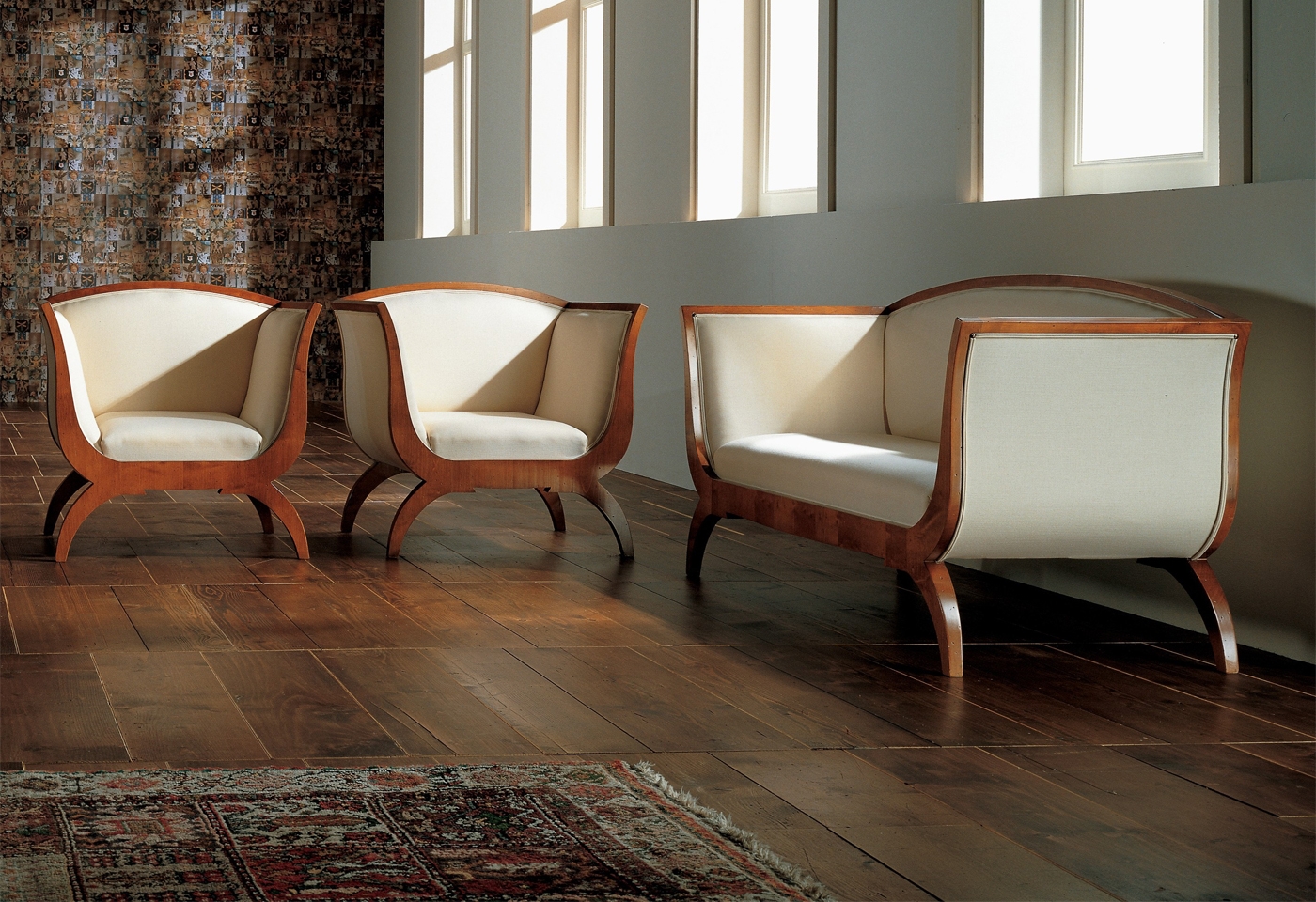 Poltrona in legno di ciliegio finemente intagliato, con schienale sagomato e imbottitura interna ed esterna.