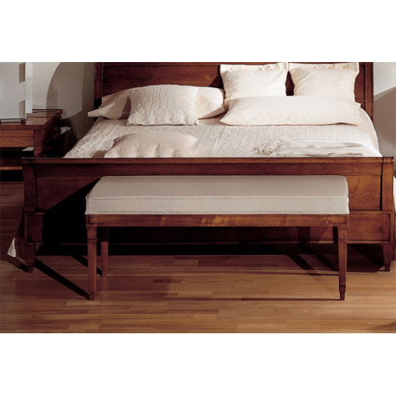 Sgabello in legno di ciliegio sagomato con seduta imbottita.