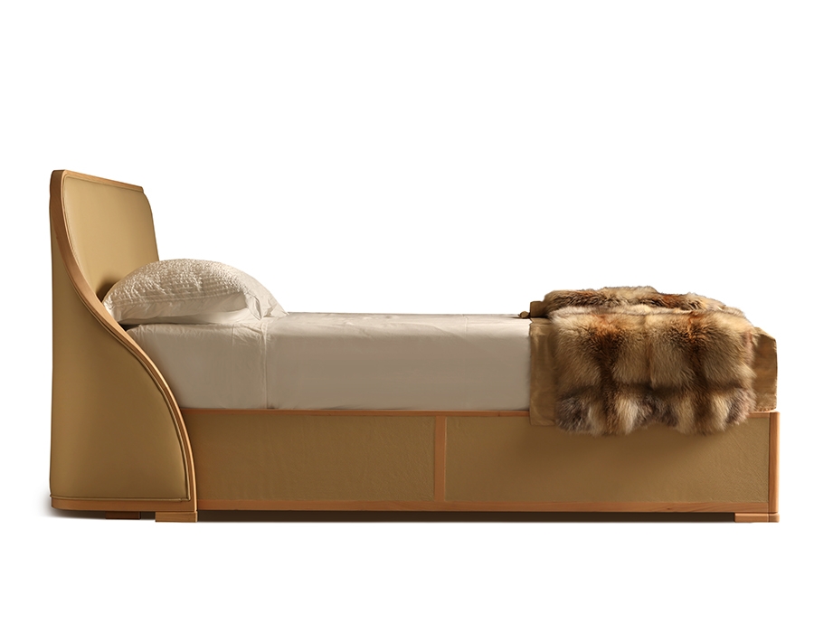 Letto con vano contenitore in legno di ciliegio e pelle. Testiera con profilo in legno sagomato ad elica. Supporto materasso estraibile in doghe di legno.