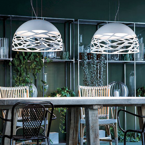 Seductive beauty with character thanks to a perfect laser cut openings that creates a play of light and shadow. The kelly design is a unique, large scale pendant available in various sizes. The inner glass diffuser hides the light source.
