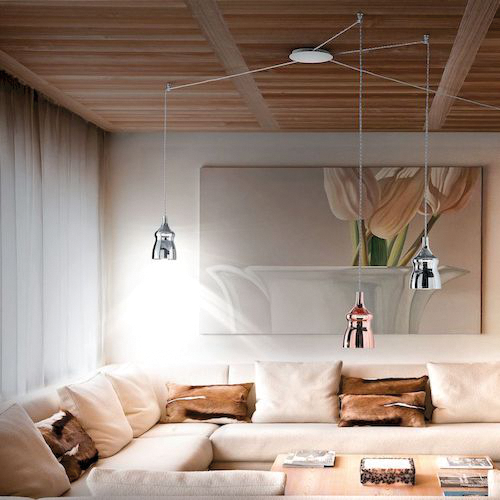 A perfect blend of retro and modern, this decorative pendant design is made from blown glass and utilizes the most advanced led technology. Small, medium, large in four different rich colors: gold, silver, rose gold and clear glass gives the possibility to create and play with the fixtures, creating a contact with the same and allowing customization of the compositions. These details and materials, used in their creation, characterizes the influence of the venetian context where the company resides, careful and high-quality workmanship of the glass reflects the ancient tradition of glass. The chrome metal structure holds the led light source, which produces a warm light that becomes slightly visible once lit. The reflective element of the glass remains constant, yet changes with the advent of the light that peers through the glass.