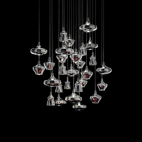 A perfect blend of retro and modern, this decorative pendant design is made from blown glass and utilizes the most advanced led technology. Small, medium, large in four different rich colors: gold, silver, rose gold and clear glass gives the possibility to create and play with the fixtures, creating a contact with the same and allowing customization of the compositions. These details and materials, used in their creation, characterizes the influence of the venetian context where the company resides, careful and high-quality workmanship of the glass reflects the ancient tradition of glass. The chrome metal structure holds the led light source, which produces a warm light that becomes slightly visible once lit. The reflective element of the glass remains constant, yet changes with the advent of the light that peers through the glass.