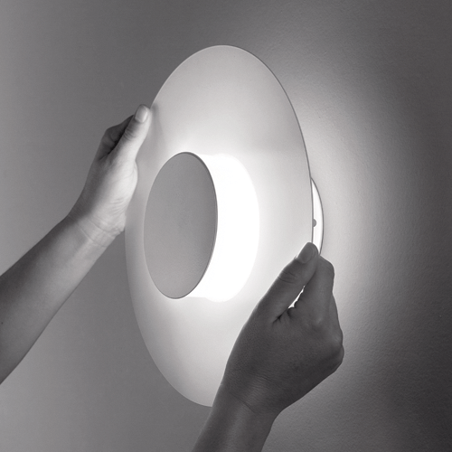 Named after the mythical god, the thor wall/ceiling light is a bold lighting fixture that creates customizable lighting effects that are similar to the different stages of the moon. The flat, round shade is made from metal and attaches to a glass cylindrical mount. The shade can be moved up and down the cylindrical mount allowing for the increase or decreas
