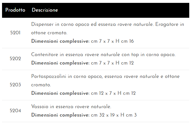 Set bagno in corno opaco, essenza rovere naturale e ottone cromato.