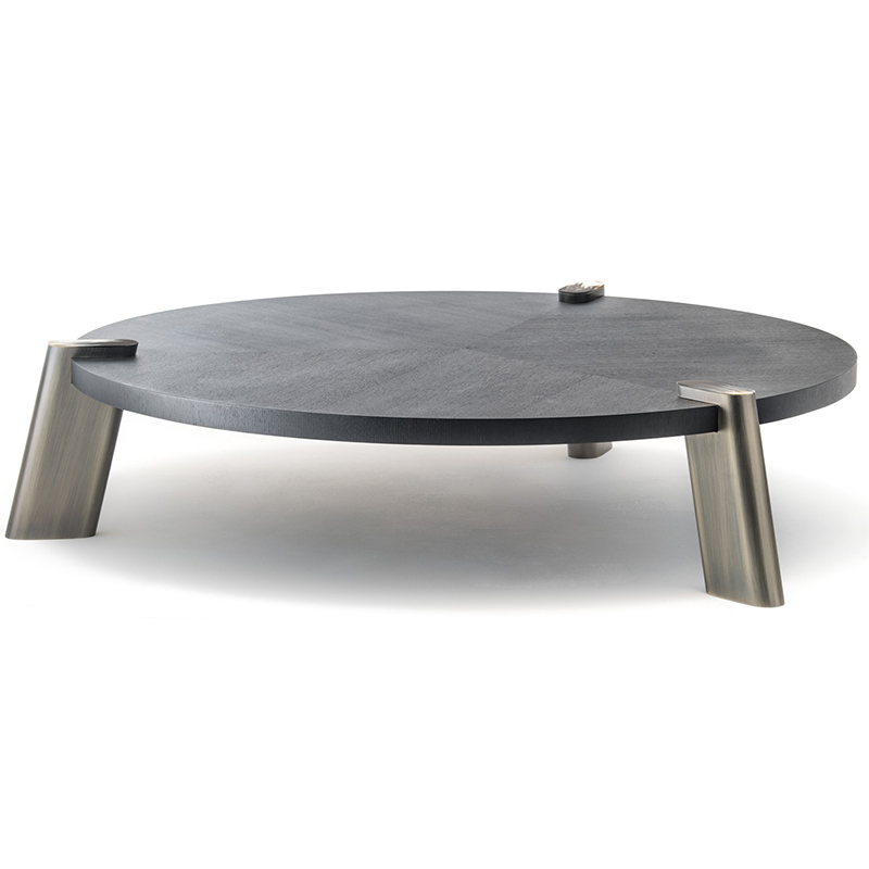 Tavoli bassi in essenza rovere e piedi in acciaio ottonato con applicazioni in corno opaco.