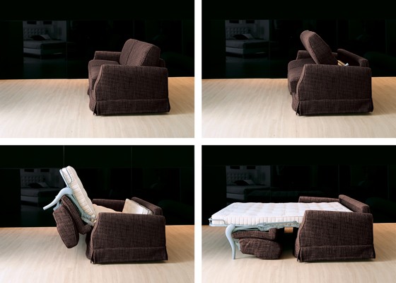 Divano in tessuto tre posti letto, con struttura in legno. Imbottitura in poliuretano espanso indeformabile a densità differenziata per cuscini seduta e schienale. Completamente sfoderabile. La rete fissa è in metallo elettrosaldata ed il materasso a molle è alto 15 cm. È disponibile anche la versione fissa nelle dimensioni da 2 a 3 posti. Трехместный раскладной диван в ткани, структура из дерева. Подушки сидений и спинки выполнены из вспененного полиуретана с дифференцированной плотностью пены. Полностью съемные чехлы. Металлическая решетка кровати с механизмом для ежедневного использования, матрас на пружинках высотой 15 см. Возможно изготовление двухместных и трехместных диваны без механизма трансформации.