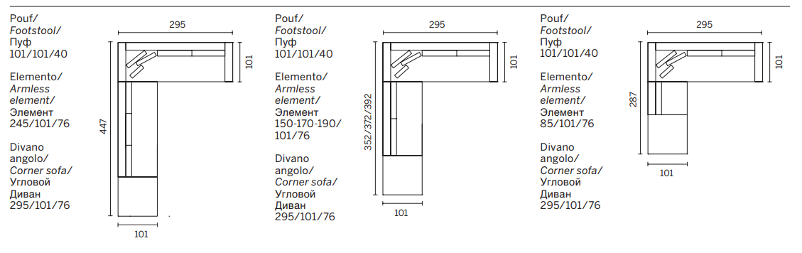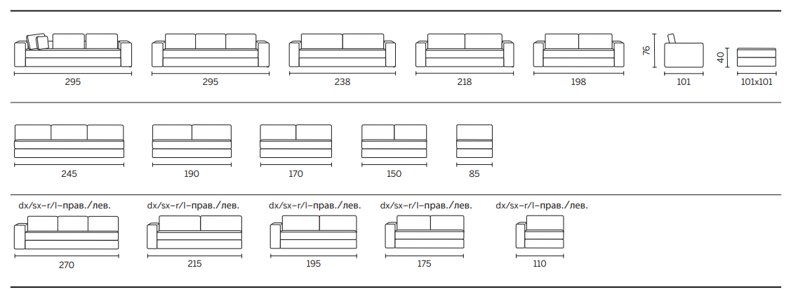 Struttura in legno, cuscini di seduta in poliuretano espanso indeformabile a densità differenziata ricoperto da falda acrilica, cuscini di schienale in piuma, molleggio con cinghie elastiche incrociate. Realizzabile in pelle, tessuto e Alcantara. Sfoderabilità totale nella versione in tessuto, solo cuscini di seduta schienale nella versione in pelle. Versione letto non prevista. Структура из дерева. Подушки сидений выполнены из вспененного полиуретана с дифференцированной плотностью пены, сверху полиуретан покрыт слоем акрила, а на подушках спинки обивка из пуха. Подвеска на эластичных скрещенных ремнях. Материал обивки: кожа, ткань и Алькантара. Полностью съемные чехлы изготавливаются в ткани, на версии в коже съемные чехлы только на подушках спинки и сидения. Версия с раскладной кроватью не предусмотрена.
