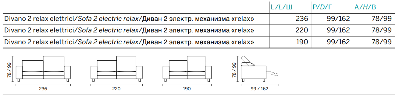 Struttura in legno. Imbottitura seduta e schienale in poliuretano espanso indeformabile a densità differenziata ricoperto da falda acrilica, molleggio con cinghie elastiche incrociate. Seduta allungabile e reclinabile con meccanismo relax elettrico. Appoggiatesta solo manuale. Optional presa USB. Realizzabile solo in pelle. Nessuna sfoderabilità. Versione letto non prevista. Каркас деревянный. Набивка сидений и спинки из пенополиуретана разной плотности, обтянуто стеганным акриловым слоем, рамочная структура на эластичных поясах. Сидение выдвижное и откидывается с помощью электрического механизма «релакс». Подголовник регулируется вручную. Дополнительно имеется порт USB. Модель доступна только в ткани. Чехлы съемные. Версия со спальным местом не предусмотрена.