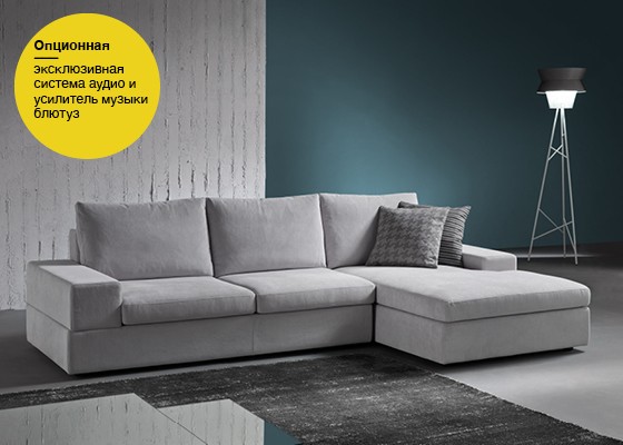 Struttura in legno. Cuscini di seduta in poliuretano espanso indeformabile con falda acrilica. Cuscini di schienale in piuma. Molleggio con cinghie elastiche incrociate. Realizzabile in tessuto e pelle. Completamente sfoderabile nella versione in tessuto. Versione letto non prevista. Optional l’esclusivo sistema audio ed amplificazione musica bluetooth. Структура из дерева. Подушки для сидений из недеформируемого пенополиуретана с покрытием из акрила. Подушки спинки из пуха. Подвеска на эластичных перекрещенных ремнях. Обивка из ткани и из кожи. Чехлы полностью съёмные для варианта из ткани. Вариант кровати не предусмотрен. Возможно использование в модели системы аудио и усилителя для музыки, применяемое с bluetooth.