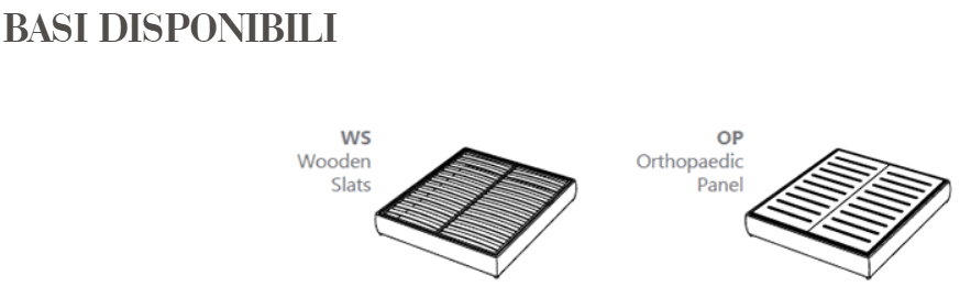 Struttura portante in legno massello. Imbottitura in poliuretano espanso rivestito da tessuto accoppiato protettivo. Rivestimento in tessuto o pelle. Disponibile con rete a doghe o con pannello ortopedico rivestito.