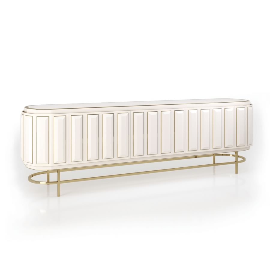 Madia in legno. Disponibile laccata in colori RAL o rivestita in tessuto o pelle. Inserti in metallo: effetto bronzo, oro, cromo, verniciato in colori RAL.