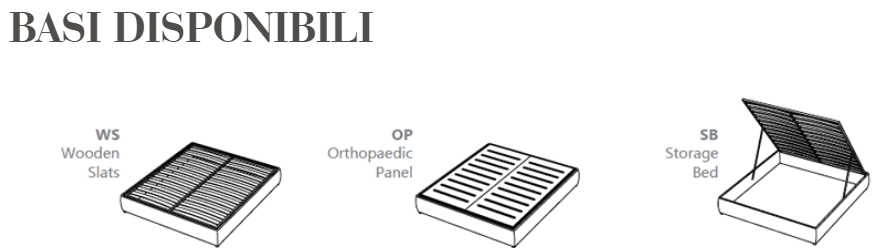 Struttura portante in metallo e legno. Imbottitura in poliuretano espanso rivestito da tessuto accoppiato protettivo. Rivestimento in tessuto o pelle. Disponibile con rete a doghe, pannello ortopedico rivestito o contenitore con rete a doghe.