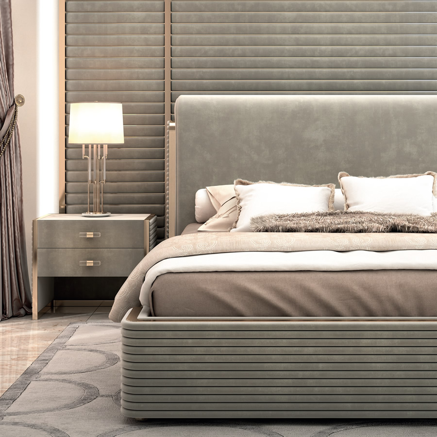 Comodino in legno. Disponibile in diverse essenze secondo campionario o laccato in colori RAL. Inserti in metallo: effetto bronzo, oro, cromo, verniciato in colori RAL.