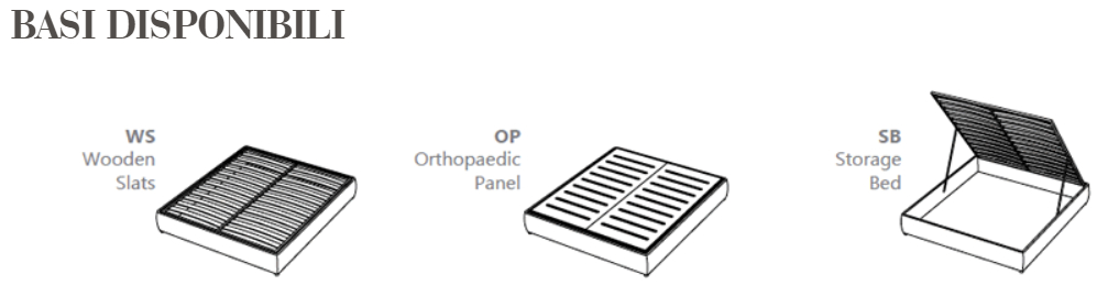 Struttura in legno Ebano Makassar o legno tinto. Imbottitura cuscini testata in poliuretano espanso e dacron. Rivestimento cuscini testata in tessuto o pelle. Disponibile con rete a doghe o pannello ortopedico rivestito.