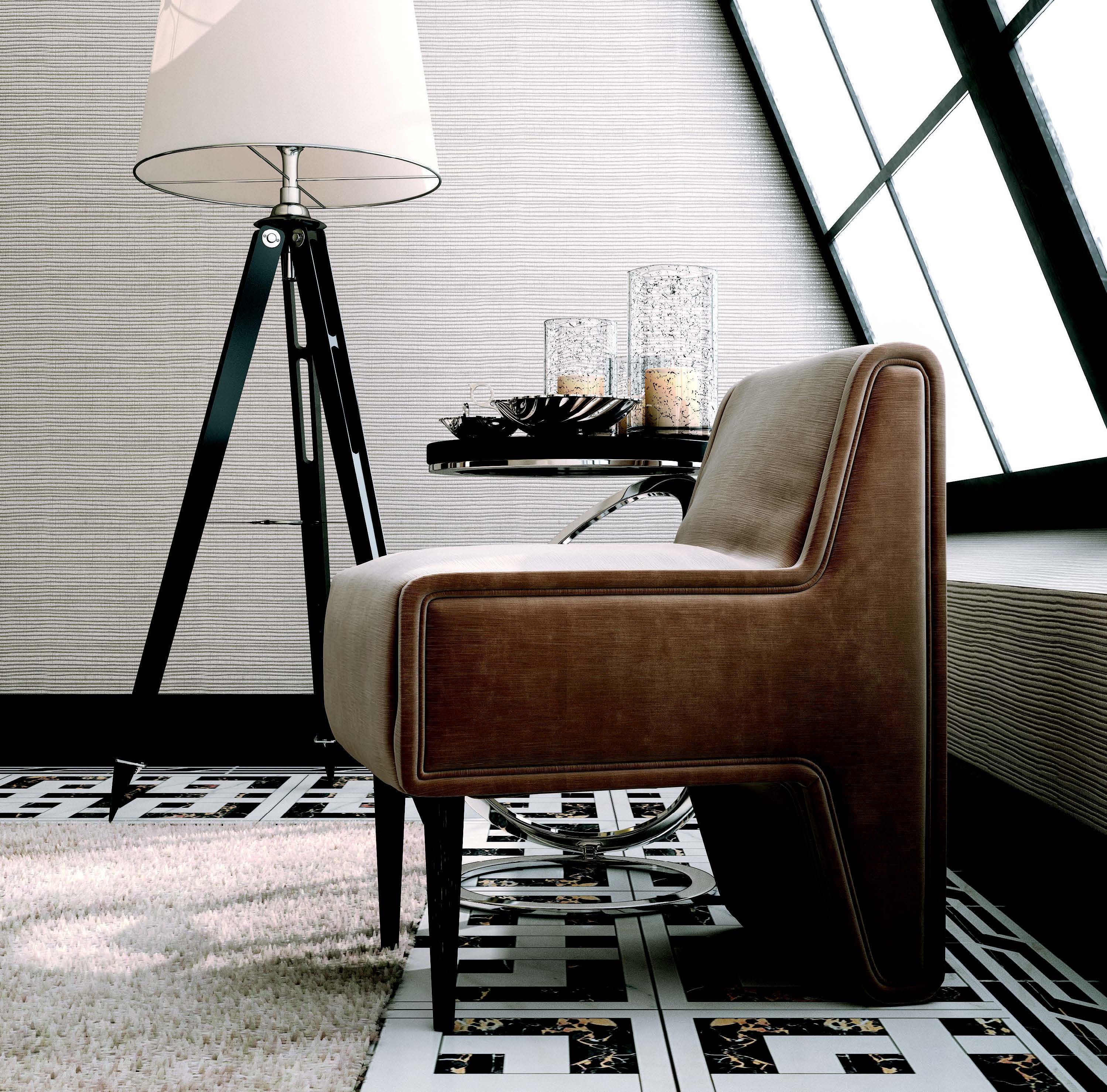 Rivestimento in tessuto o pelle. Inserti in metallo: effetto ottone verniciato, nickel satinato, cromo, verniciato in colori RAL.