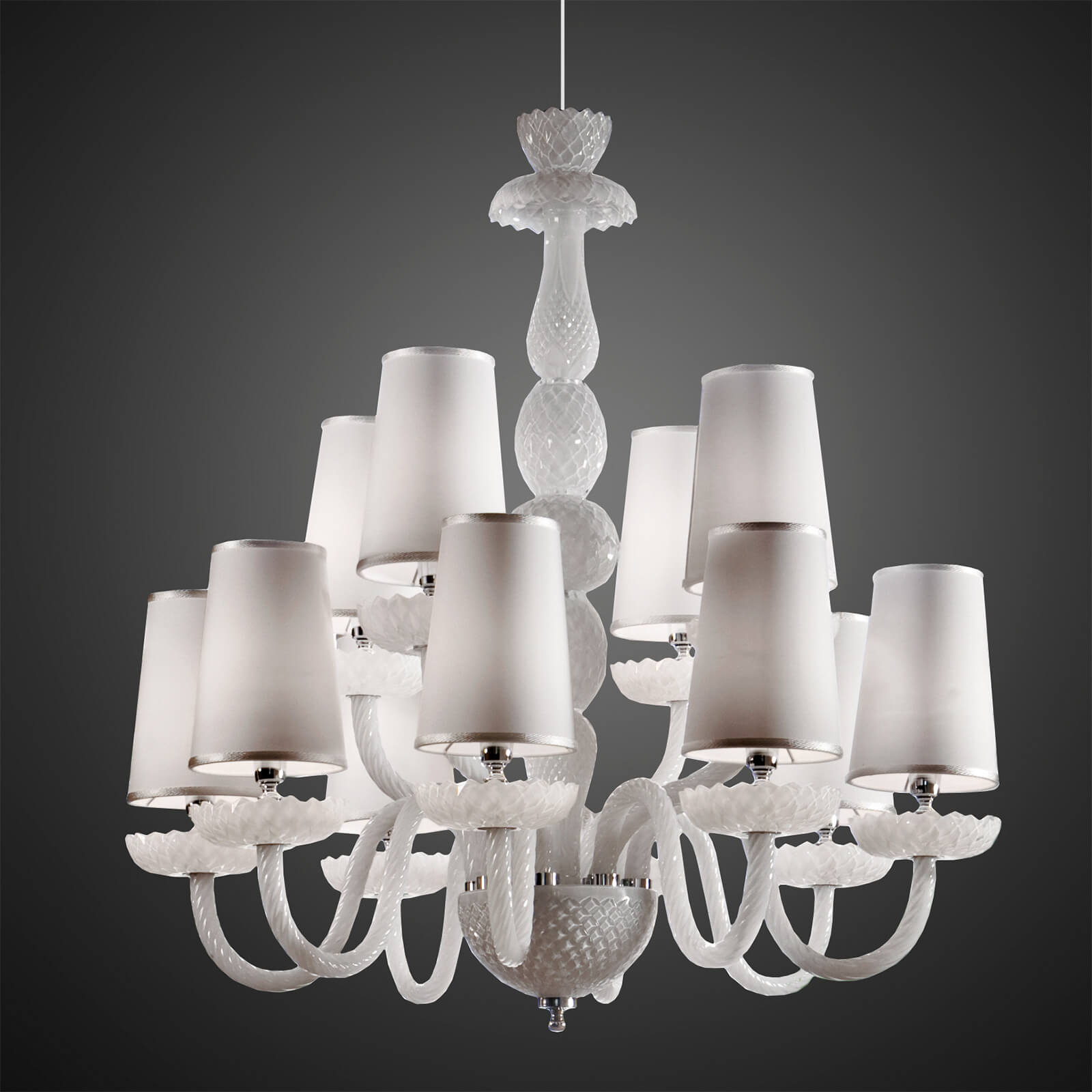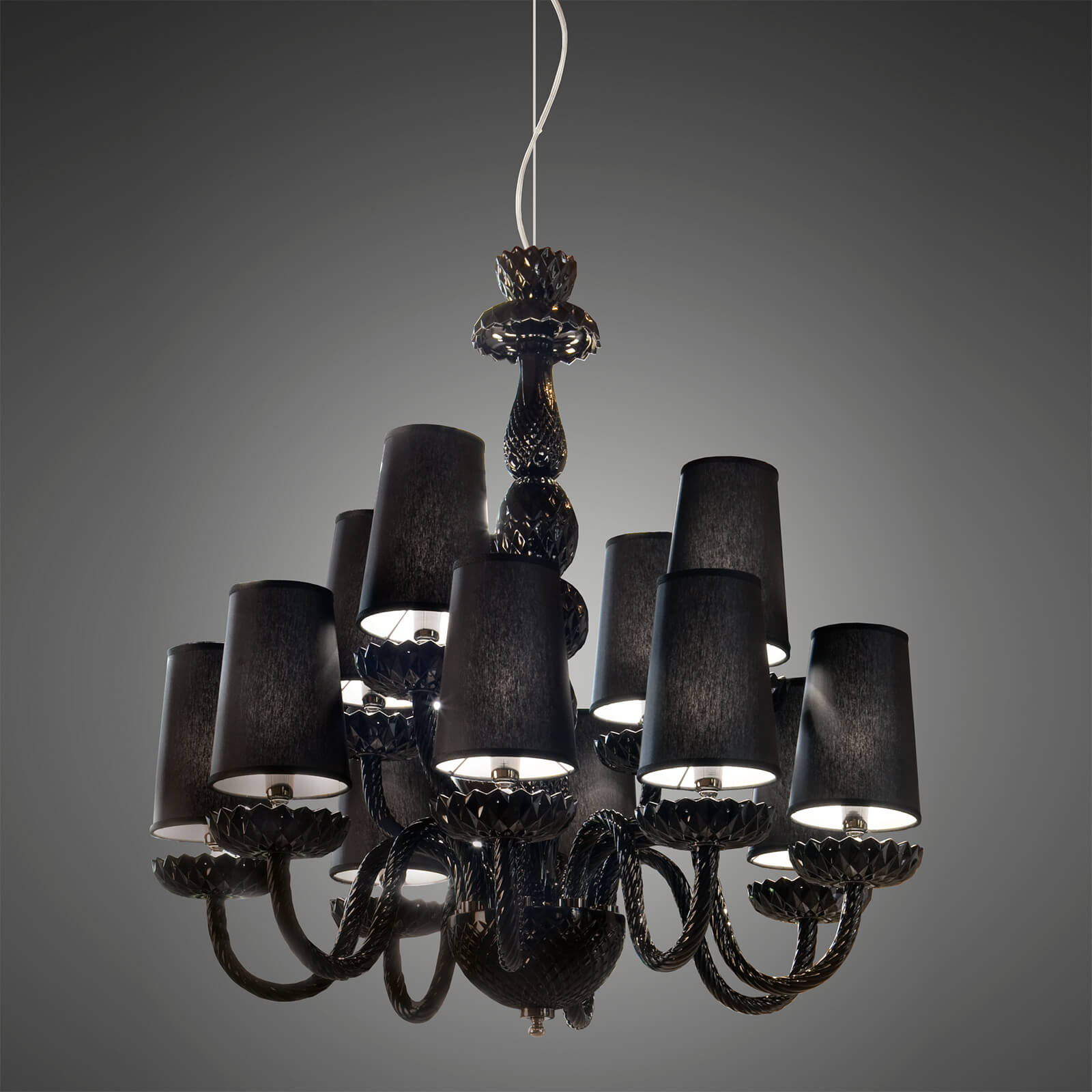 Chandelier in black carved crystal, metal with iron grey finish, black fabric shades. Availalble in different dimensions and colours. Opera Classic Collection.