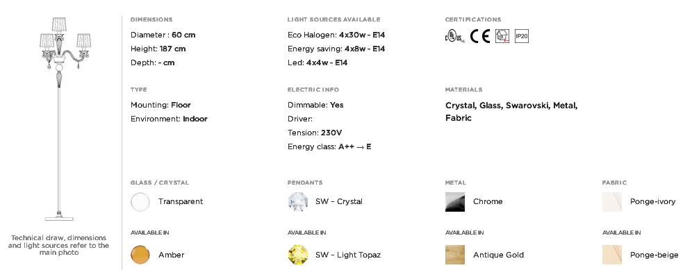 Floor lamp in metal with chrome finish and crystal with ivory plissè fabric shades and Swarovski Elements pendants. Available in different colours. Opera Classic Collection.