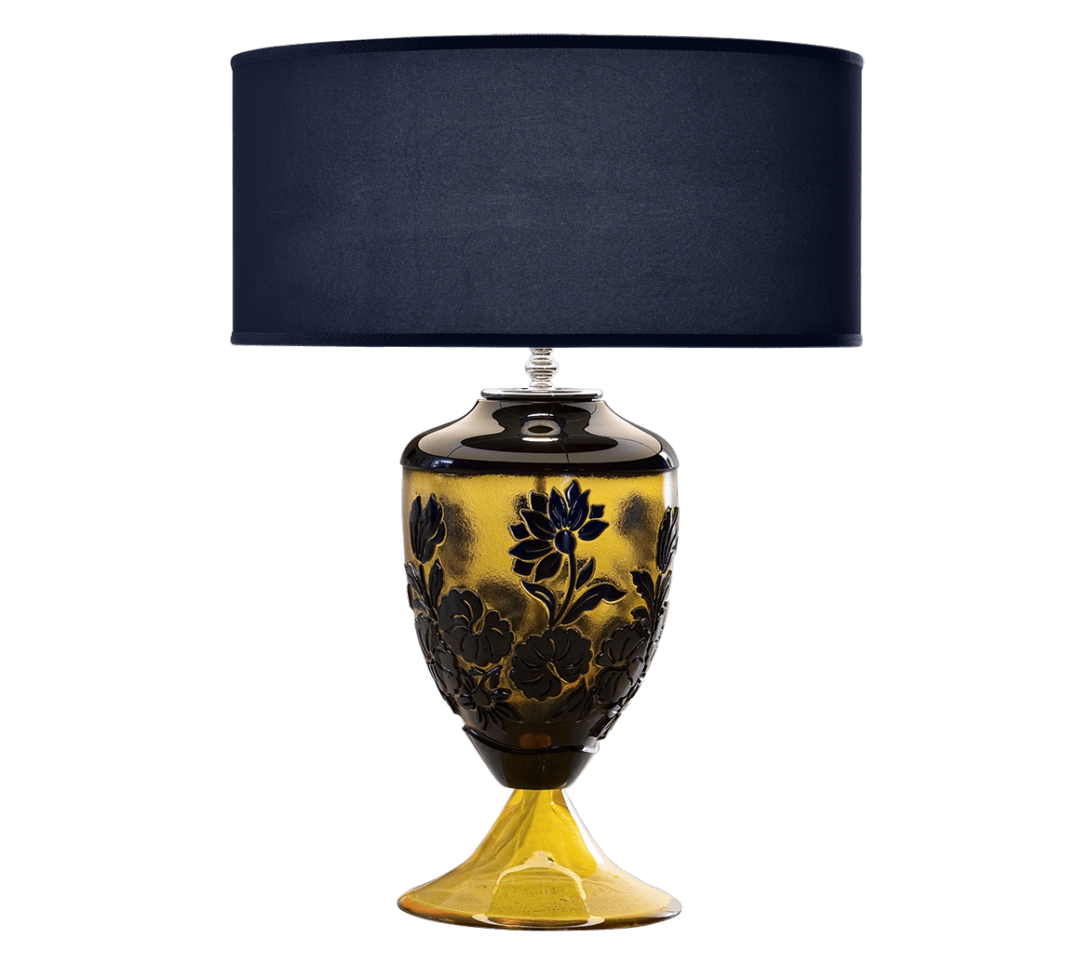 Table lamp in amber and blue overlaid crystal, with blue navy fabric shade. Metal details with nickel finish. Available in different colours. Opera Classic Collection.