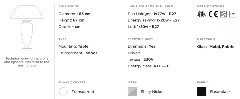 Table lamp in blown glass with metal base in nickel finish. Black fabric shade. Incanto Modern Collection.