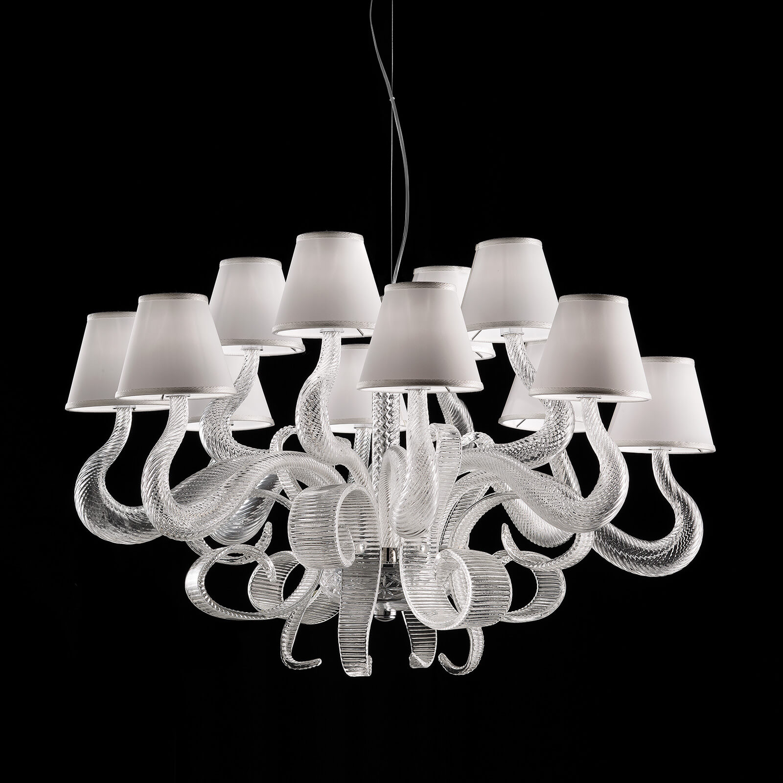Chandelier in glass with twisted glass arms, metal structure with chrome finish and ivory fabric shades. Available in different dimensions. Opera Classic Collection.