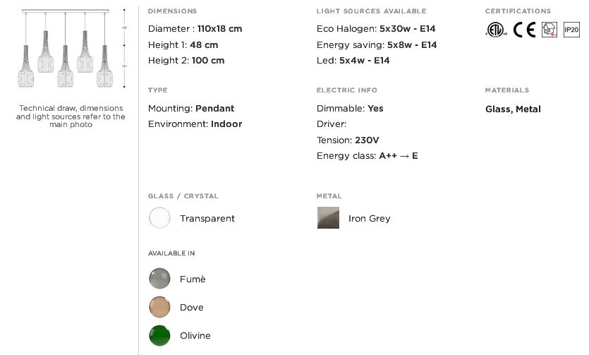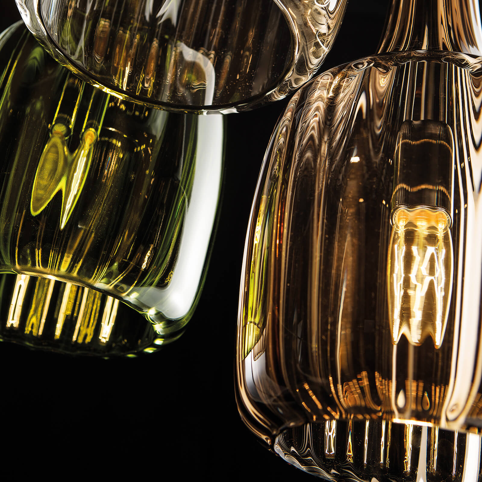 Pendant with blown glass diffusers available in four glass finishes and colours: transparent, fumè, dove and olive green. Metal with iron grey finish. Incanto Modern Collection.
