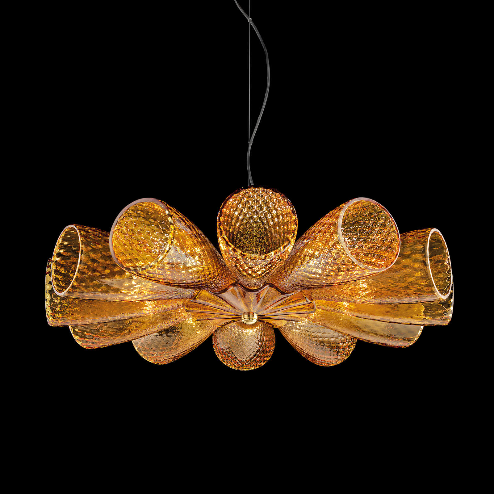 Pendant in colored glass with shiny gold metal finish. Available in different dimensions and colours. Incanto Modern Collection.
