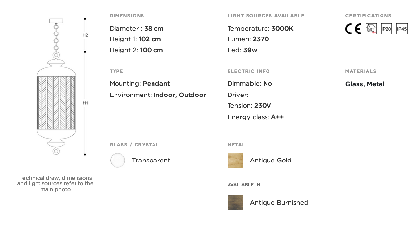 Pendant in metal with antique gold finish and carved glass diffuser. Incanto Modern Collection.
