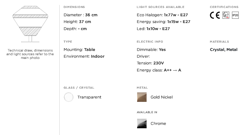 Table lamp in carved clear and nickel gold crystal and nickel gold metal structure. Incanto Modern Collection.