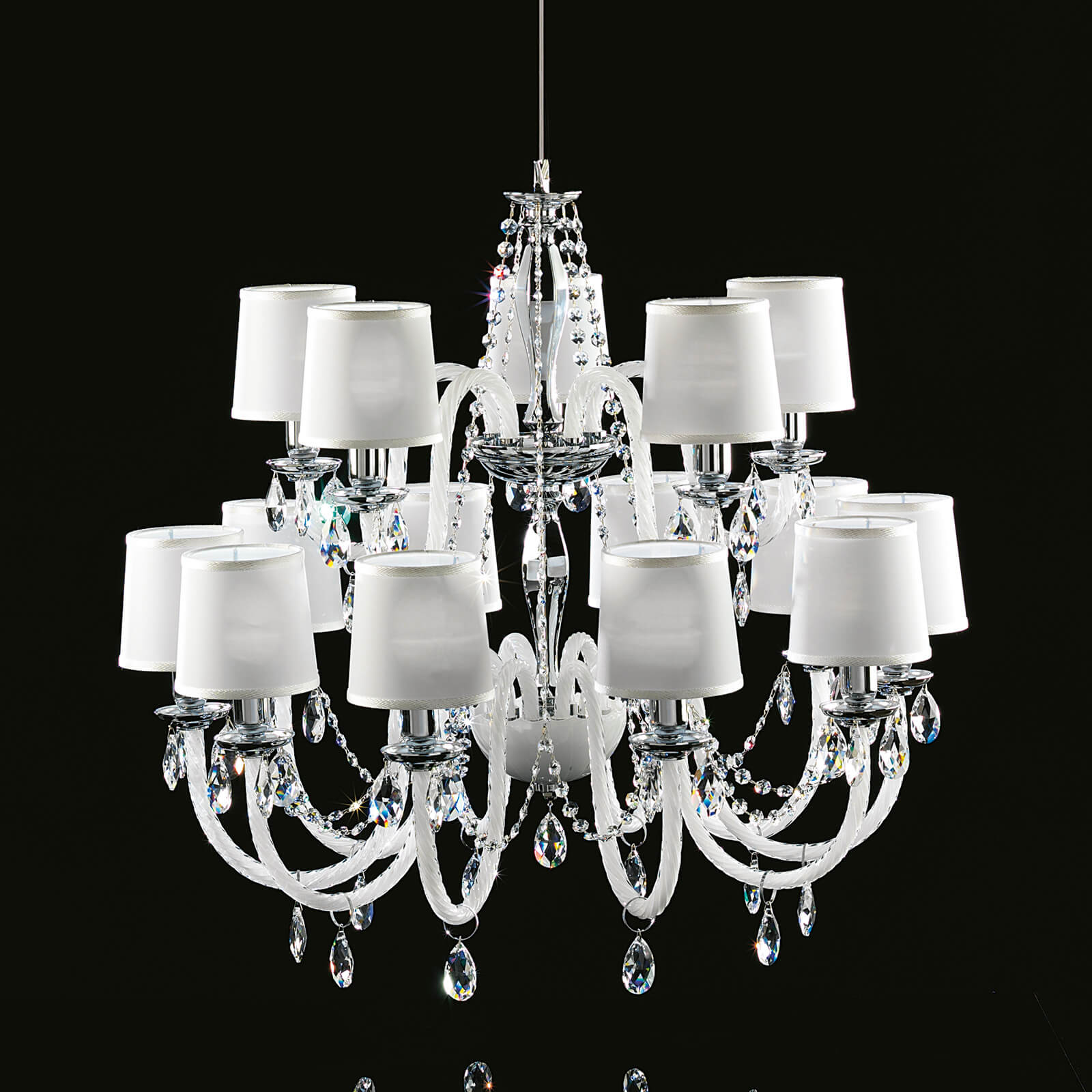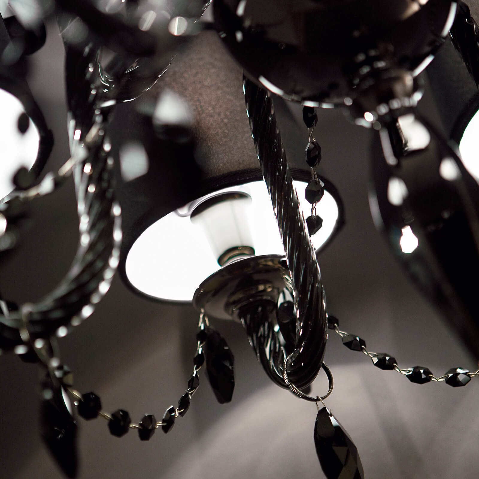 Chandelier in black carved glass, metal structure with iron grey finish, black fabric shades and Swarovski Elements pendants. Available in different dimensions and colours. Opera Classic Collection.