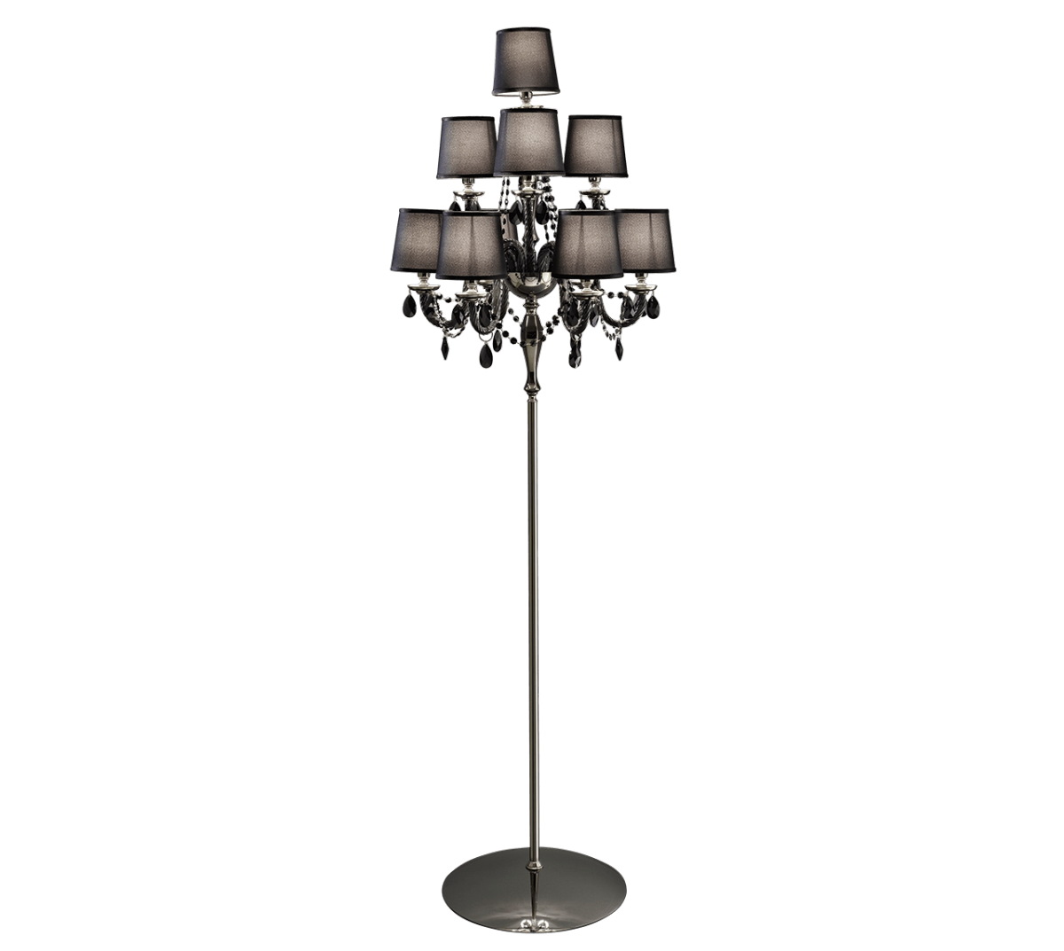 Floor lamp in black glass and metal with iron grey finish, black fabric shades and Swarovski Elements pendants. Available in different dimensions and colours. Opera Classic Collection.