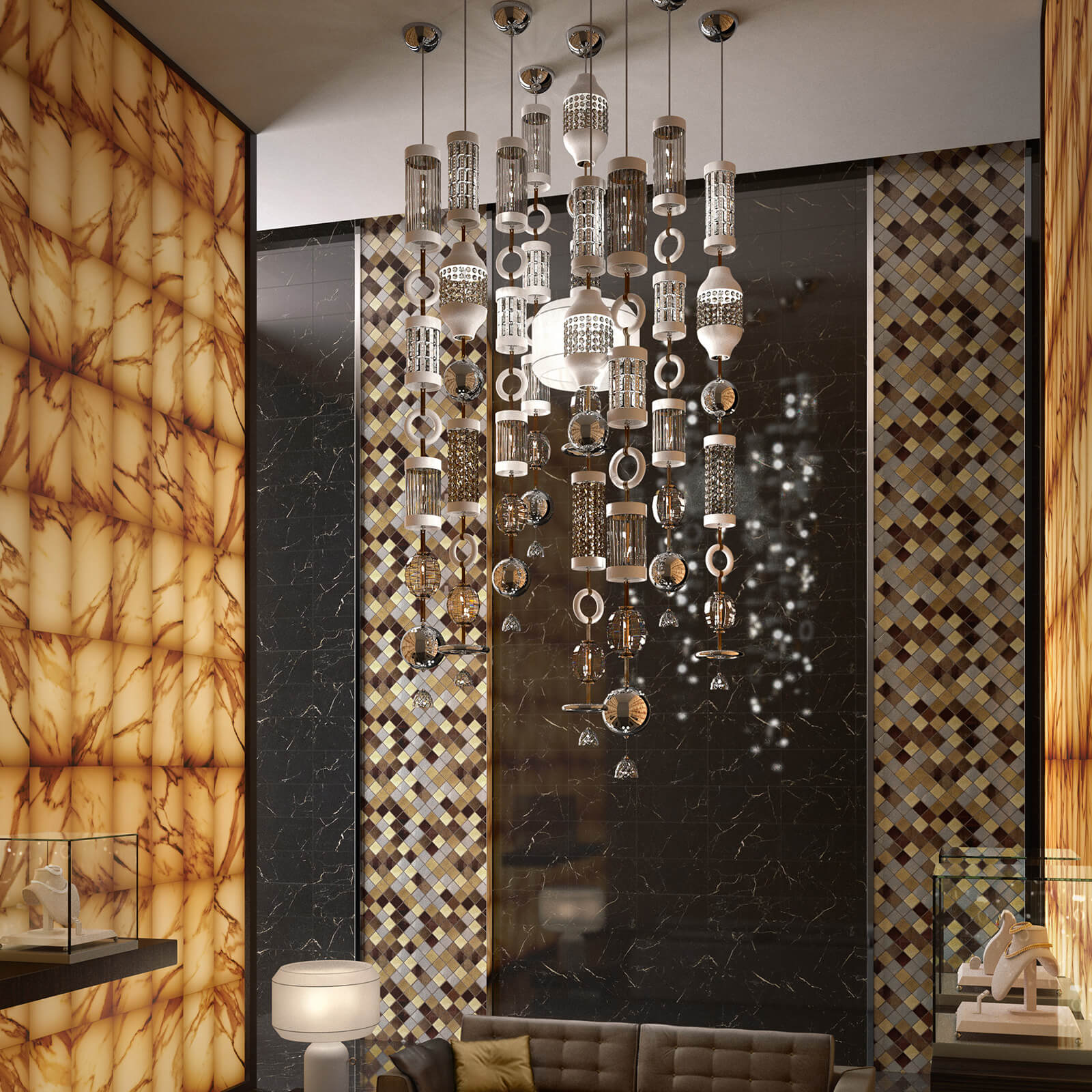 Pendant made of glass, metal, crystal, leather and ceramic elements. Available in different dimensions and colours. Incanto Modern Collection.