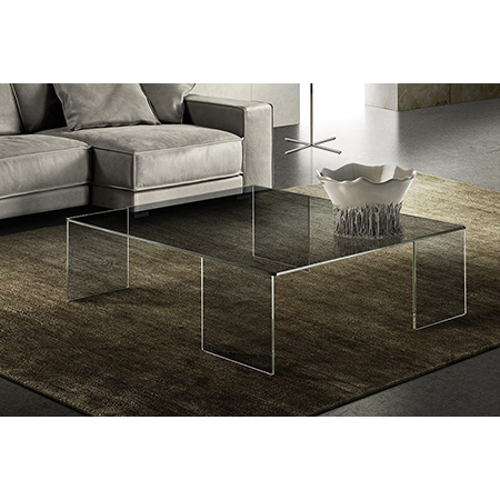 Top in vetro temperato trasparen- te 10 mm molato a filo lucido. Piedini in vetro trasparente o bronzo.