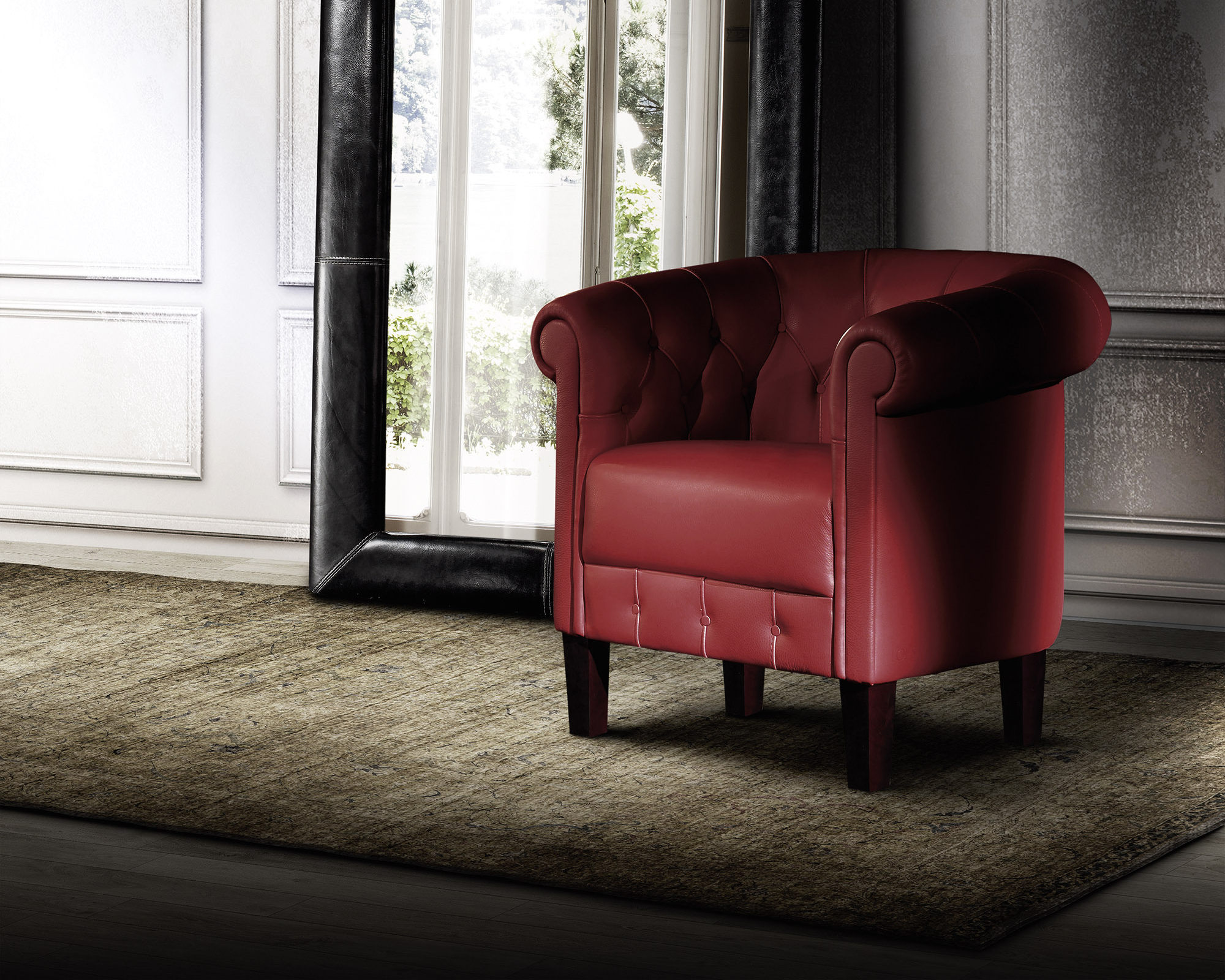 Struttura in legno, molleggio con molle coniche. Imbottitura in poliuretano espanso ad alta densità differenziata, rivestito da falda acrilica. Piedi in legno. Wood frame, springiness with conical springs. High different densities polyurethane foam filling, covered with acrylic padding. Wood feet.