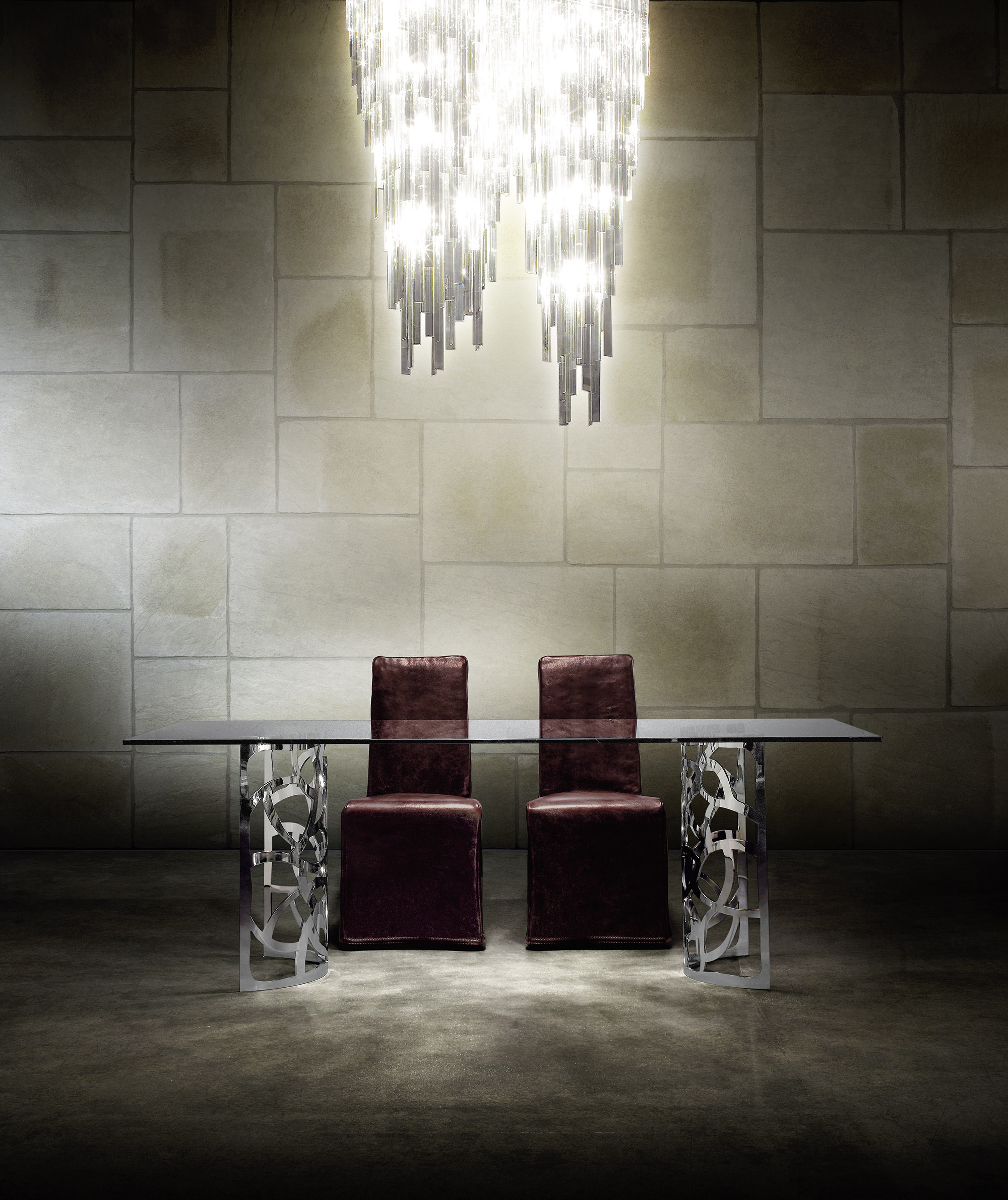 Base in acciaio cromato spessore 8 mm. Vetro float trasparente spesso- re 15 mm molato a filo lucido.