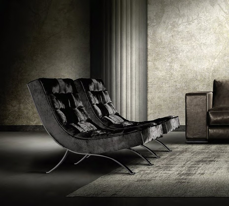 Struttura in metallo cromato e legno, cinghie elastiche incrociate ad alta componente in caucciù. Imbottitura in poliuretano espanso ad alta densità differenziata. Wood and chrome steel frame, intertwined elastic belts with high rubber content. High different densities polyurethane foam filling.