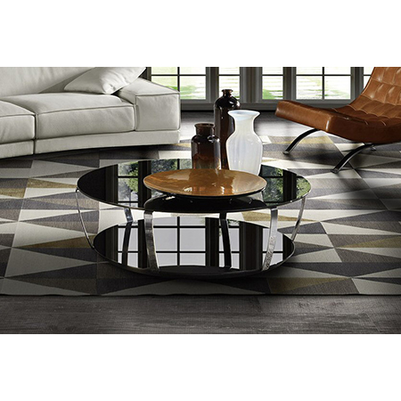 Supporti in piatto d’acciaio cromato, pannello in m.d.f. verniciato nero. Vetro spessore 10 mm. molato a ﯧlo lucido, temperato, laccato nero.