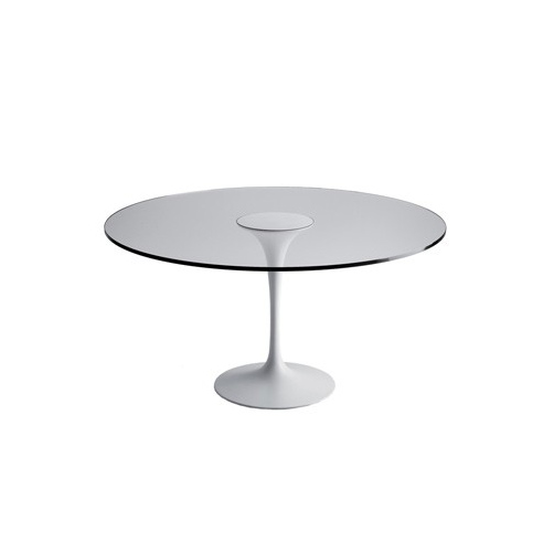 The tables designed for Vassar College add a new interpretation to the “dialectical relationship” between table top and base developed by Eero Saarinen in his former designs . The fine curved lines of the base are enhanced by the transparency of the glass table top. Since 2006, Matrix International produces exclusively the tables , both in coffee lower version than high dining one.