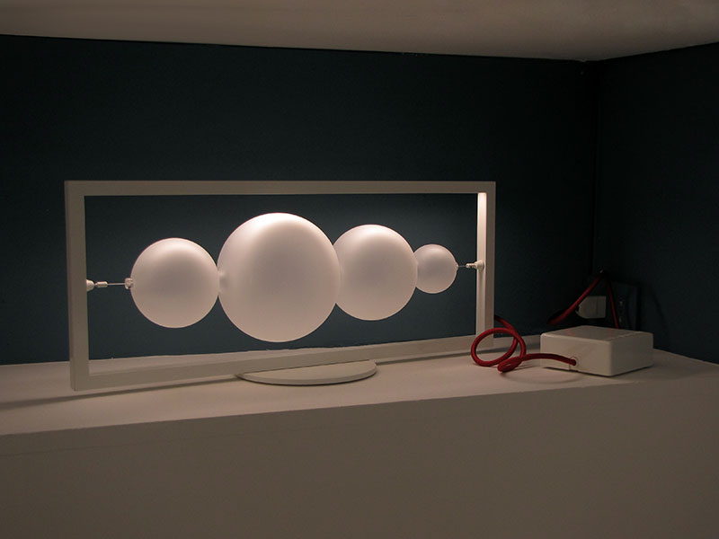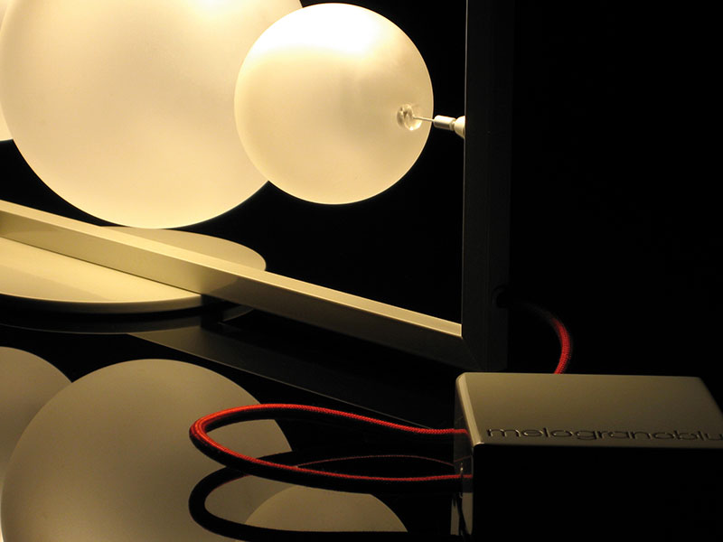 Table lamp with reflected light.The LED light source inside the painted aluminium frame hits the glass which reflects the light on the table top. The frame can be personalised in the colours: white, red or black.