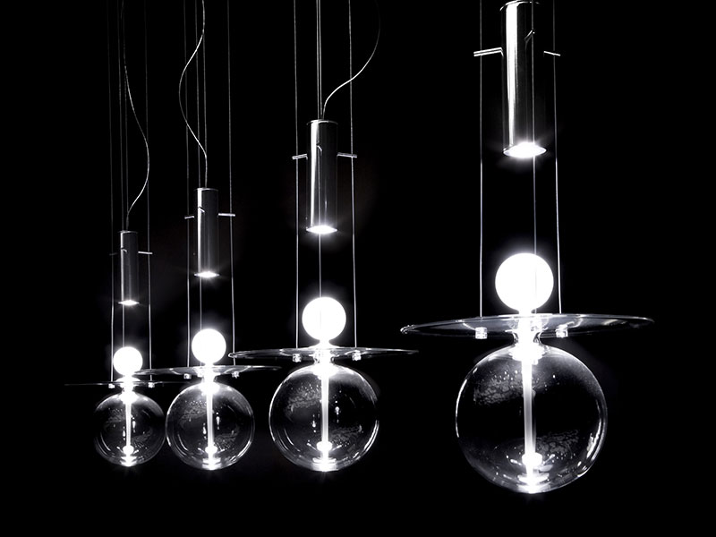 Suspended lamp with direct and reflected lights.The aluminum lamp body projects lower the light vertically through the glass. The distance between the light source and glasses can be varied to create a different lighting effect.