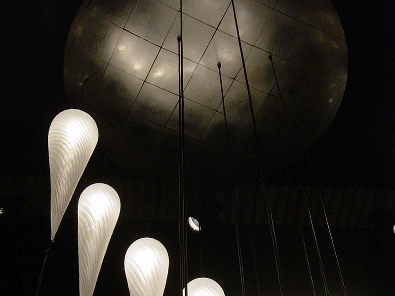 Round ceiling chandelier in fibre glass, hand decorated in gold or silver leaf, or lacquered in requested colours. Different glass shapes and sizes available. 40 cm or 70 cm tassel included.