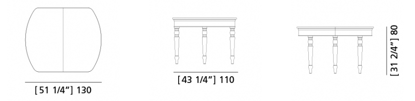 Tavolo allungabile rettangolare con piano sagomato e gambe tornite in legno di ciliegio. Struttura interna in legno allungabile fino a 330 cm con 4 prolunghe interne da 50cm. Quinta gamba centrale di sostegno.