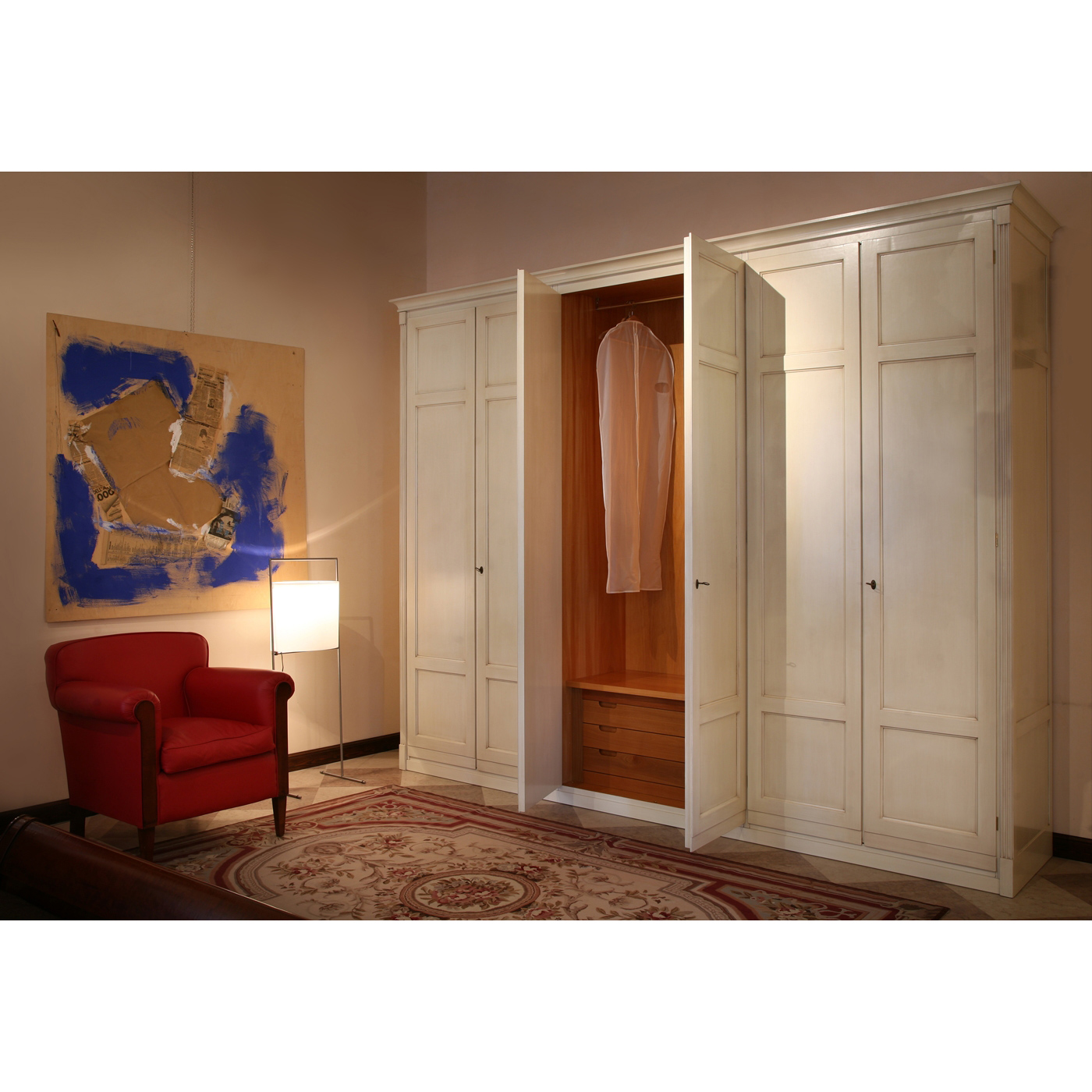 Guardaroba a 4 ante realizzato in legno di ciliegio con pregiata fresatura sui fianchi e con cornice di chiusura. Interno: 4 ripiani regolabili e 4 aste appendiabiti. Accessori su richiesta: cassettiera a 3 cassetti; portacravatte; portapantaloni; cassaforte; appendiabiti inclinabile; specchio.