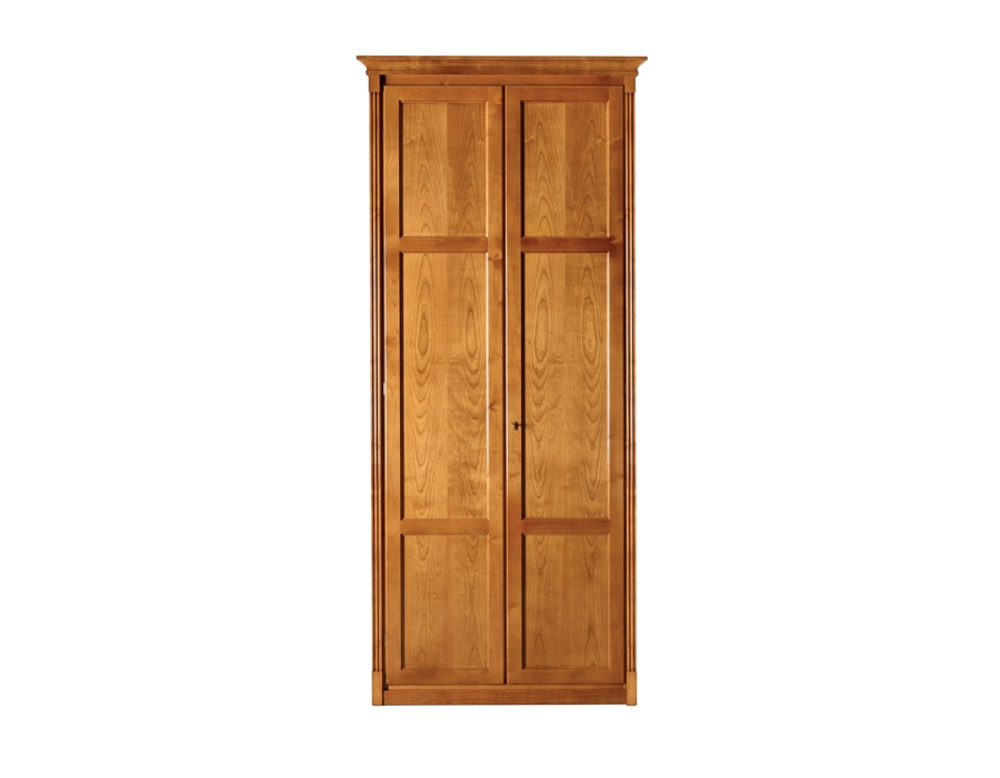 Guardaroba a 2 ante realizzato in legno di ciliegio con pregiata fresatura sui fianchi e con cornice di chiusura. Interno: 2 ripiani regolabili e 2 aste appendiabiti. Accessori su richiesta: cassettiera a 3 cassetti; portacravatte; portapantaloni; cassaforte; appendiabiti inclinabile; specchio.
