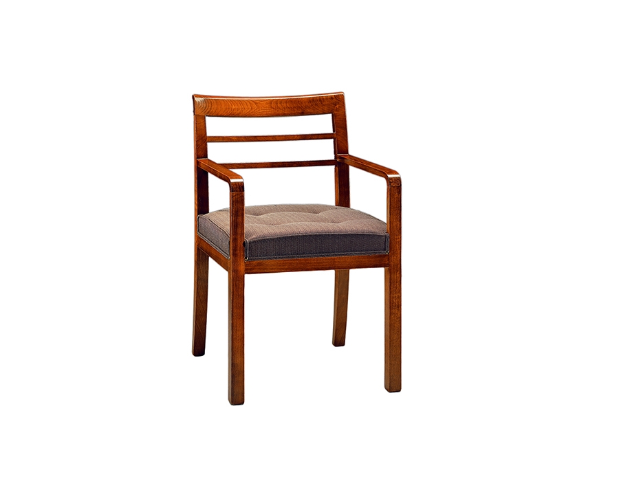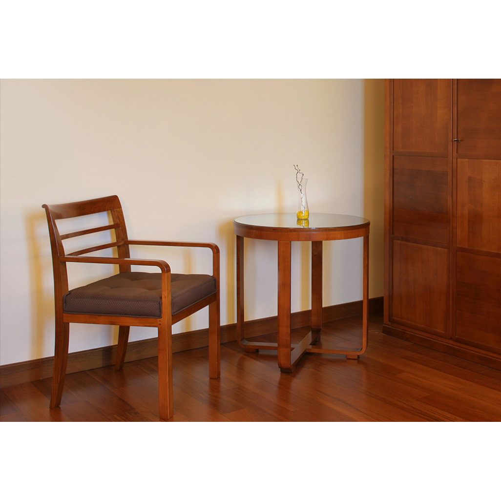 Poltroncina in legno massello di ciliegio con schienale sagomato e seduta imbottita. Su richiesta in legno di noce canaletto.