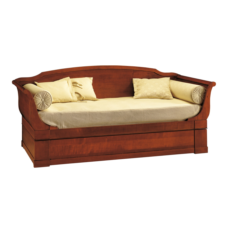 Letto in legno di ciliegio con testiera e pediera in legno. Secondo letto singolo estraibile a cassettone. 2 supporti in doghe di legno.
