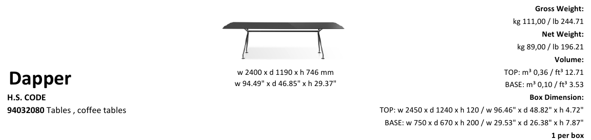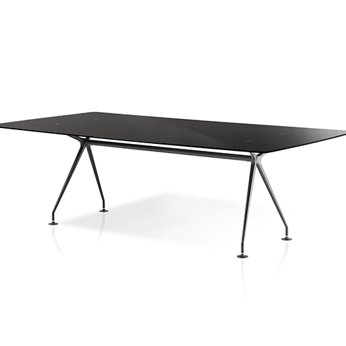 Dapper is a large table composed by a lacquered glass top on die-cast aluminium legs. The extreme simplicity of this table conceals the need to create a practical furnishing element, aesthetically incisive in spite of its sobriety.