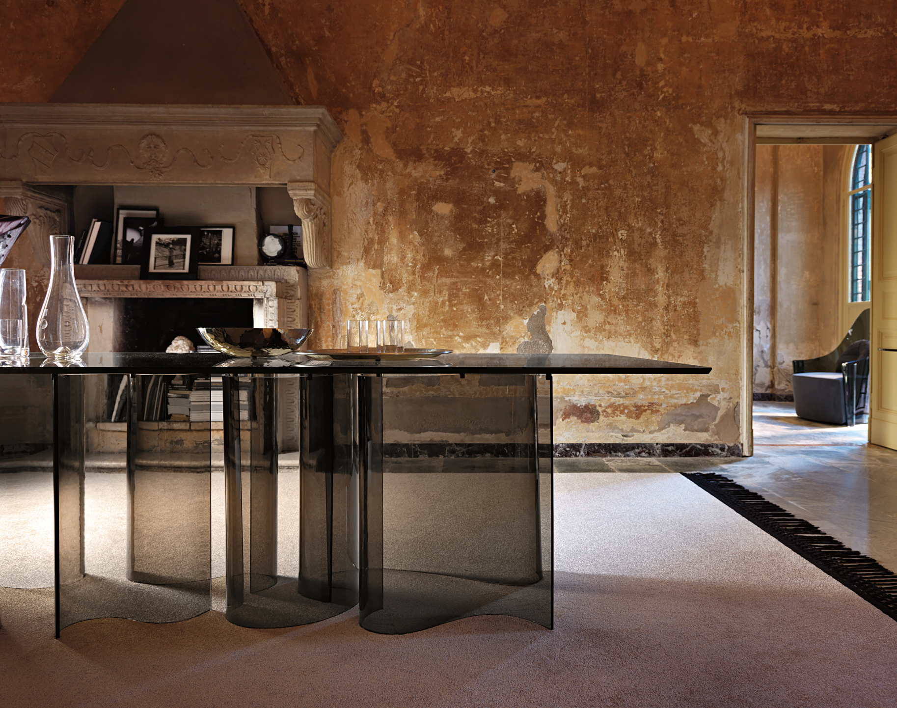 Tavolo con piano in vetro fumè stratificato o temperato, bisellato. Base composta da elementi in vetro fumè curvato da 10 mm. Il numero di elementi varia a seconda delle dimensioni del piano.